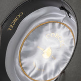 Este sombrero viene con un cordón tripolino de 3 mm que da dos vueltas alrededor de la base de la copa, y se une con un elegante punteado de hilo 20/2 en el mismo tono del cordón.